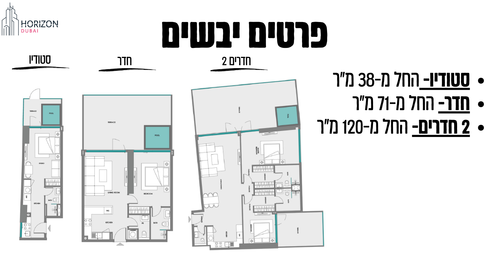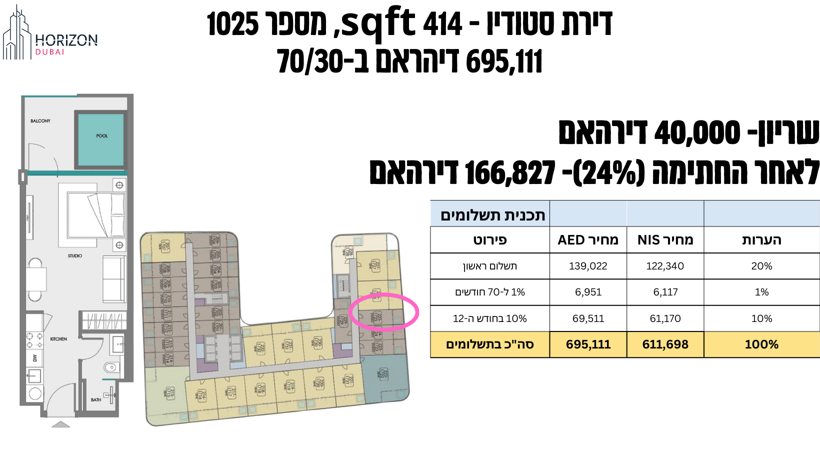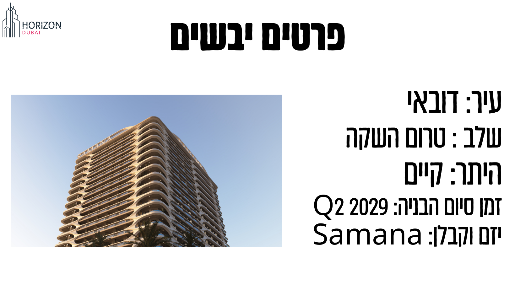 פרויקט חדש ומעולה מבית סמאנה בשכונת דובאילנד. עם קרבה לתחנת המטרו קו כחול, שכונת האוניברסיטות ושכונת ההייטק. פרויקט ברמת גימור גבוה, הכולל מטבח קומפלט עם מוצרי חשמל גרמניים, בריכה פרטית בכל מרפסת ומתקני בניין ברמה גבוה- בריכות, חדרי כושר, חדר קולנוע, מגרש כדורסל,חדר עסקים, אזור ילדים ואזור ברביקיו. החל מ-700 אלף דירהאם לסטודיו ו1.15 מליון דירהאם לדירת חדר בתכנית תשלומים למשך 6 שנים ללא ריבית! ועם הנחה קבוצתית מעולה, שער שקל:דירהאם הגבוה שהיה מאז הסכמי אברהם, הנחה מיוחדת רק למשקיעי הורייזן דובאי וקומה מספר 10 בבלעדיות שלנו, אתם מבטיחים עסקה מעולה בתנאים שוברי שוק! הון עצמי החל מ-140 אלף ש״ח בלבד לדירת סטודיו ו230 אלף ש״ח הון עצמי התחלתי לדירת חדר