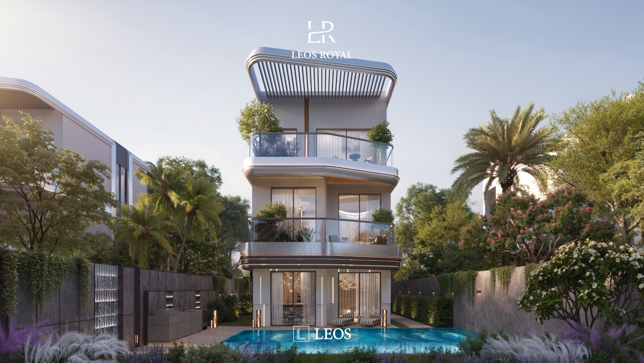 הפרויקט כולל טווח יחידות רחב של 3–7 חדרי שינה, עם דגש על בתים גדולים, תקרות בגובה 3.2 מטר, תכנון עם שטחי חוץ, וברבות מהווילות גם בריכה פרטית, חדר עוזרת, חדר נהג, חדר עבודה, מעלית או חדר כושר בהתאם לסוג היחידה. ברמת הקונספט, LEOS Royal נשען על שפת תכנון של מים, השתקפויות ומרחבים פתוחים, לצד מתקנים כמו AI Wellness Arena, AI Reflection Club, AI Aurora Walk ו-AI Halo Port המוגדר כתחנת Air Taxi. זהו פרויקט שמכוון לקהל המחפש נכס פרימיום באזור מתפתח עם נרטיב מוצר מובהק, מאסטרפלן רחב ויתרון מיקומי ברור לאורך מסדרון Al Ain Road.